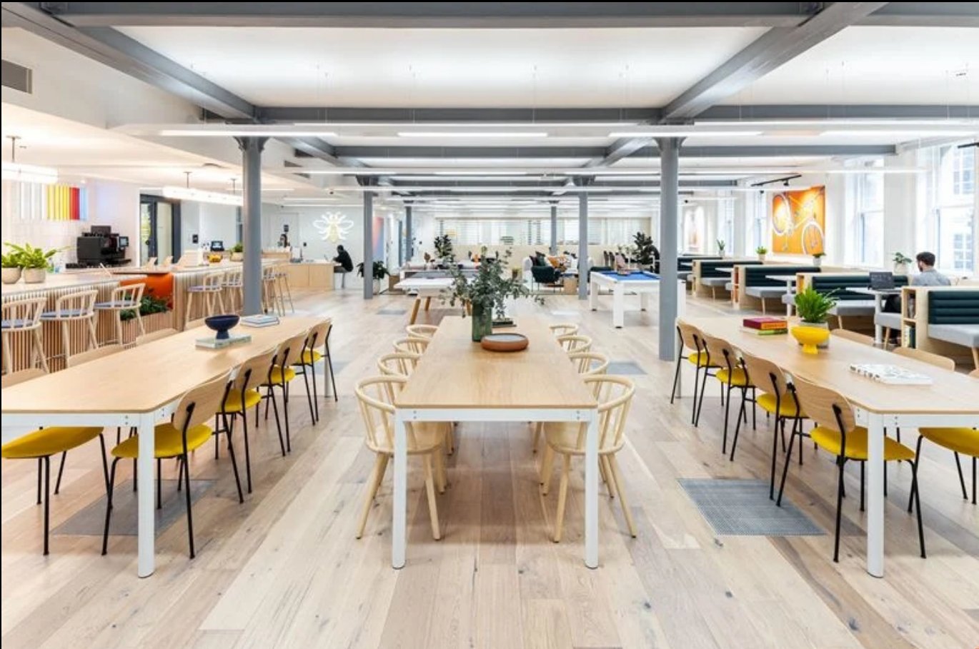Mother’s room, cycle storage, showers, event space, recreational games, wellness room, on-site staff, meeting rooms and phone booths.